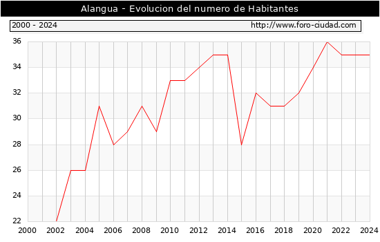 el numero de habitantes en Alangua era de 35, igual numero de habitantes que el en el año 2023. En el grafico siguiente se puede ver cuantos habitantes tiene Alangua a lo largo de los años.