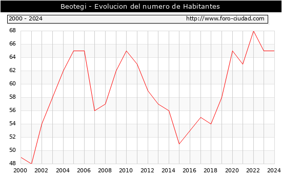 el numero de habitantes en Beotegi era de 65, igual numero de habitantes que el en el año 2023. En el grafico siguiente se puede ver cuantos habitantes tiene Beotegi a lo largo de los años.