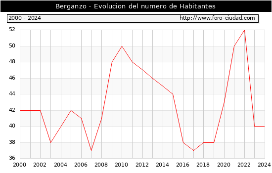el numero de habitantes en Berganzo era de 40, igual numero de habitantes que el en el año 2023. En el grafico siguiente se puede ver cuantos habitantes tiene Berganzo a lo largo de los años.