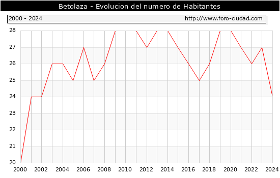el numero de habitantes en Betolaza era de 24, 3 habitantes menos que el en el año 2023. En el grafico siguiente se puede ver cuantos habitantes tiene Betolaza a lo largo de los años.