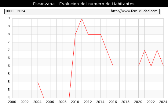 el numero de habitantes en Escanzana era de 6, 1 habitantes menos que el en el año 2023. En el grafico siguiente se puede ver cuantos habitantes tiene Escanzana a lo largo de los años.