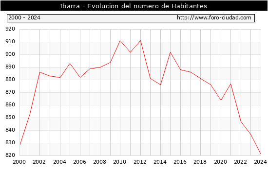 el numero de habitantes en Ibarra era de 821, 16 habitantes menos que el en el año 2023. En el grafico siguiente se puede ver cuantos habitantes tiene Ibarra a lo largo de los años.