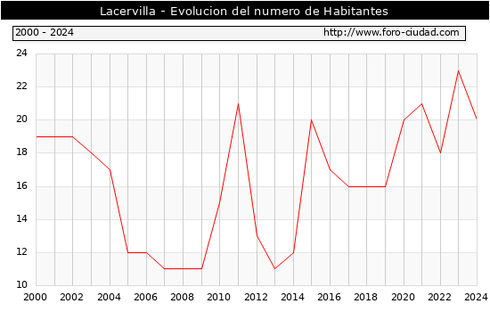 el numero de habitantes en Lacervilla era de 20, 3 habitantes menos que el en el año 2023. En el grafico siguiente se puede ver cuantos habitantes tiene Lacervilla a lo largo de los años.