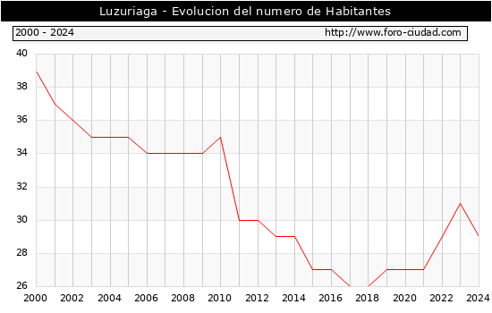 el numero de habitantes en Luzuriaga era de 29, 2 habitantes menos que el en el año 2023. En el grafico siguiente se puede ver cuantos habitantes tiene Luzuriaga a lo largo de los años.