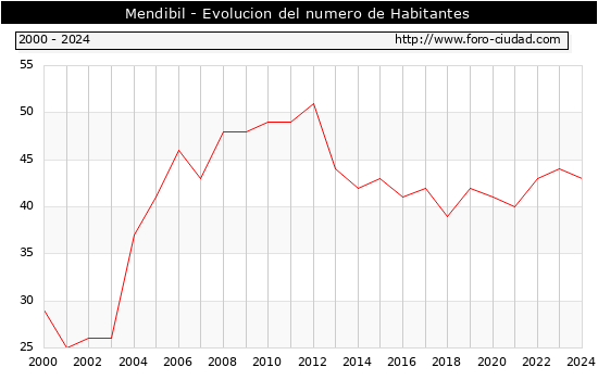 el numero de habitantes en Mendibil era de 43, 1 habitantes menos que el en el año 2023. En el grafico siguiente se puede ver cuantos habitantes tiene Mendibil a lo largo de los años.