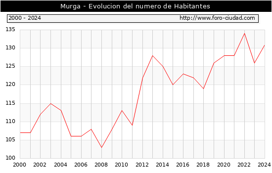 el numero de habitantes en Murga era de 131, 5 habitantes mas que el en el año 2023. En el grafico siguiente se puede ver cuantos habitantes tiene Murga a lo largo de los años.