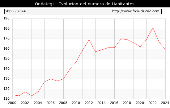el numero de habitantes en Ondategi era de 159, 8 habitantes menos que el en el año 2023. En el grafico siguiente se puede ver cuantos habitantes tiene Ondategi a lo largo de los años.