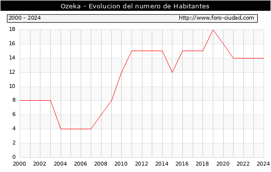 el numero de habitantes en Ozeka era de 14, igual numero de habitantes que el en el año 2023. En el grafico siguiente se puede ver cuantos habitantes tiene Ozeka a lo largo de los años.