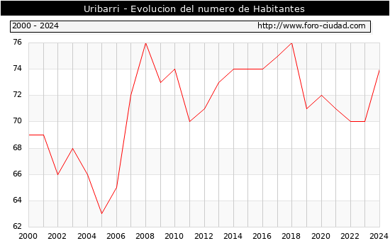 el numero de habitantes en Uribarri era de 74, 4 habitantes mas que el en el año 2023. En el grafico siguiente se puede ver cuantos habitantes tiene Uribarri a lo largo de los años.