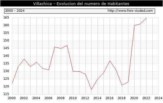 el numero de habitantes en Villachica era de 165, igual numero de habitantes que el en el año 2023. En el grafico siguiente se puede ver cuantos habitantes tiene Villachica a lo largo de los años.