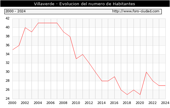 el numero de habitantes en Villaverde era de 27, igual numero de habitantes que el en el año 2023. En el grafico siguiente se puede ver cuantos habitantes tiene Villaverde a lo largo de los años.