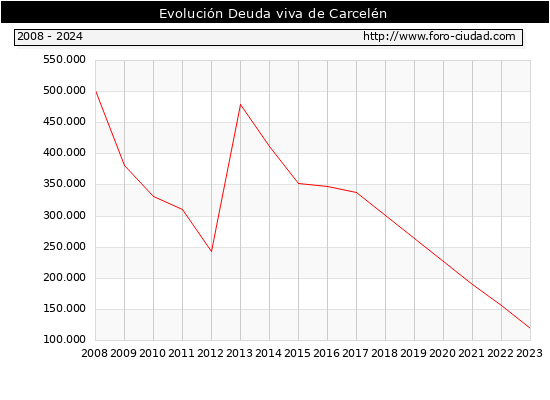 Carcelén - Deuda viva del Ayuntamiento a 31/12/2024 Carcelén - Deuda viva del Ayuntamiento a 31/12/2024 Segun el Ministerio de Economia y Hacienda el Ayuntamiento de Carcelén a 31/12/2024 posee una deuda de 79.000 € . La deuda viva a 31/12/2023 ascendia a 120.000 € por lo que en el ultimo año la deuda se redujo en -41.000 €. ![]()
