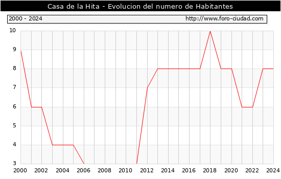 el numero de habitantes en Casa de la Hita era de 8, igual numero de habitantes que el en el año 2023. En el grafico siguiente se puede ver cuantos habitantes tiene Casa de la Hita a lo largo de los años.
