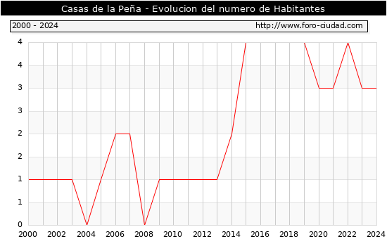 el numero de habitantes en Casas de la Peña era de 3, igual numero de habitantes que el en el año 2023. En el grafico siguiente se puede ver cuantos habitantes tiene Casas de la Peña a lo largo de los años.