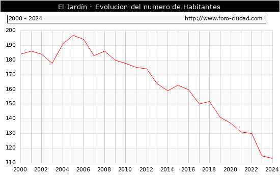 el numero de habitantes en El Jardín era de 113, 2 habitantes menos que el en el año 2023. En el grafico siguiente se puede ver cuantos habitantes tiene El Jardín a lo largo de los años.