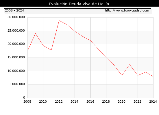 Hellín - Deuda viva del Ayuntamiento a 31/12/2024 Hellín - Deuda viva del Ayuntamiento a 31/12/2024 Segun el Ministerio de Economia y Hacienda el Ayuntamiento de Hellín a 31/12/2024 posee una deuda de 7.966.000 € . La deuda viva a 31/12/2023 ascendia a 9.645.000 € por lo que en el ultimo año la deuda se redujo en -1.679.000 €. ![]()