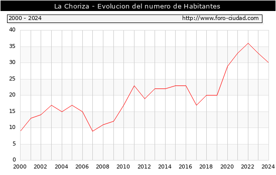 el numero de habitantes en La Choriza era de 30, 3 habitantes menos que el en el año 2023. En el grafico siguiente se puede ver cuantos habitantes tiene La Choriza a lo largo de los años.
