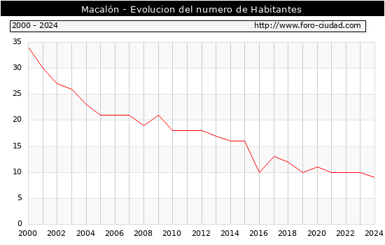el numero de habitantes en Macalón era de 9, 1 habitantes menos que el en el año 2023. En el grafico siguiente se puede ver cuantos habitantes tiene Macalón a lo largo de los años.