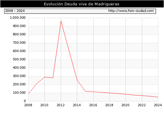 Madrigueras - Deuda viva del Ayuntamiento a 31/12/2024 Madrigueras - Deuda viva del Ayuntamiento a 31/12/2024 Segun el Ministerio de Economia y Hacienda el Ayuntamiento de Madrigueras a 31/12/2024 posee una deuda de 50.000 € . La deuda viva a 31/12/2023 ascendia a 59.000 € por lo que en el ultimo año la deuda se redujo en -9.000 €. ![]()