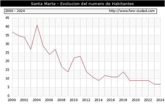 el numero de habitantes en Santa Marta era de 7, igual numero de habitantes que el en el año 2023. En el grafico siguiente se puede ver cuantos habitantes tiene Santa Marta a lo largo de los años.