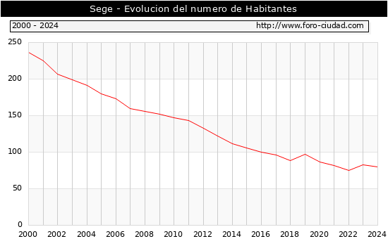 el numero de habitantes en Sege era de 80, 3 habitantes menos que el en el año 2023. En el grafico siguiente se puede ver cuantos habitantes tiene Sege a lo largo de los años.