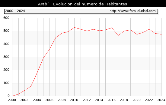 el numero de habitantes en Arabí era de 475, 7 habitantes menos que el en el año 2023. En el grafico siguiente se puede ver cuantos habitantes tiene Arabí a lo largo de los años.
