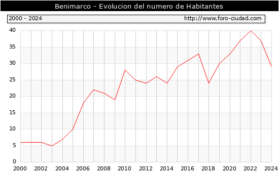 el numero de habitantes en Benimarco era de 29, 8 habitantes menos que el en el año 2023. En el grafico siguiente se puede ver cuantos habitantes tiene Benimarco a lo largo de los años.