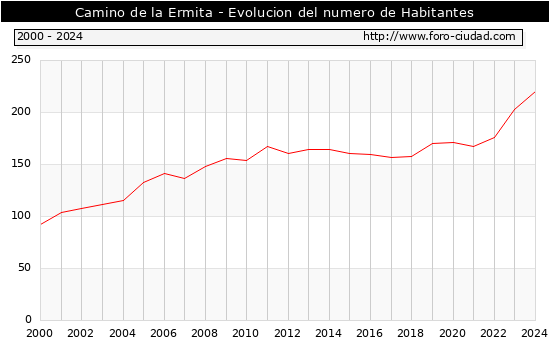 el numero de habitantes en Camino de la Ermita era de 220, 17 habitantes mas que el en el año 2023. En el grafico siguiente se puede ver cuantos habitantes tiene Camino de la Ermita a lo largo de los años.