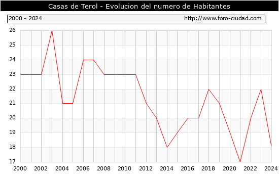 el numero de habitantes en Casas de Terol era de 18, 4 habitantes menos que el en el año 2023. En el grafico siguiente se puede ver cuantos habitantes tiene Casas de Terol a lo largo de los años.