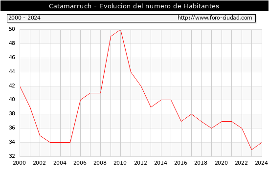 el numero de habitantes en Catamarruch era de 34, 1 habitantes mas que el en el año 2023. En el grafico siguiente se puede ver cuantos habitantes tiene Catamarruch a lo largo de los años.