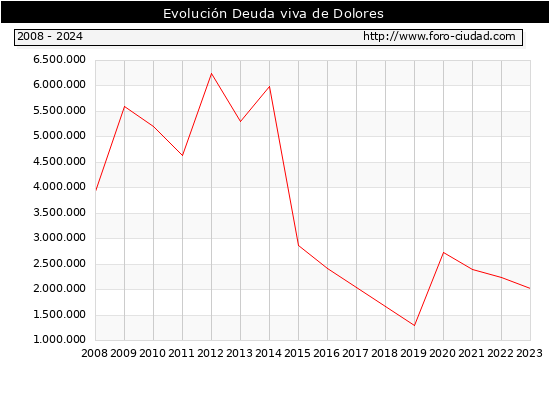 Dolores - Deuda viva del Ayuntamiento a 31/12/2024 Dolores - Deuda viva del Ayuntamiento a 31/12/2024 Segun el Ministerio de Economia y Hacienda el Ayuntamiento de Dolores a 31/12/2024 posee una deuda de 1.627.000 € . La deuda viva a 31/12/2023 ascendia a 2.018.000 € por lo que en el ultimo año la deuda se redujo en -391.000 €. ![]()