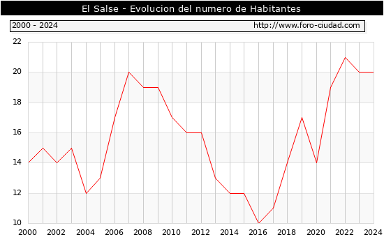 el numero de habitantes en El Salse era de 20, igual numero de habitantes que el en el año 2023. En el grafico siguiente se puede ver cuantos habitantes tiene El Salse a lo largo de los años.