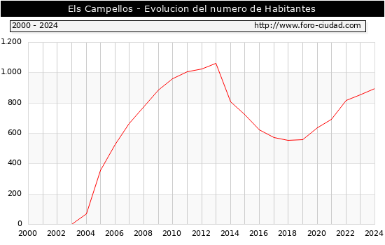 Segun los datos publicados por el INE a 1 de Enero de 2024 el numero de habitantes en Els Campellos era de 894, 41 habitantes mas que el en el año 2023. En el grafico siguiente se puede ver cuantos habitantes tiene Els Campellos a lo largo de los años.