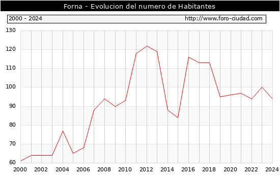 el numero de habitantes en Forna era de 94, 6 habitantes menos que el en el año 2023. En el grafico siguiente se puede ver cuantos habitantes tiene Forna a lo largo de los años.