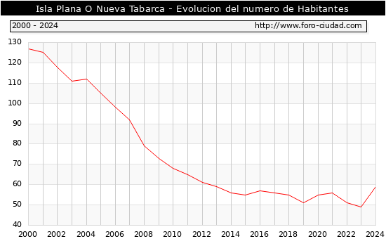 el numero de habitantes en Isla Plana O Nueva Tabarca era de 59, 10 habitantes mas que el en el año 2023. En el grafico siguiente se puede ver cuantos habitantes tiene Isla Plana O Nueva Tabarca a lo largo de los años.