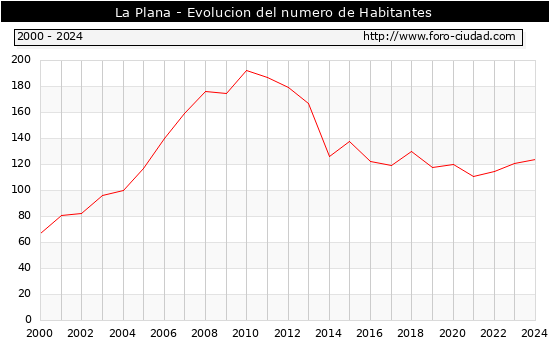 el numero de habitantes en La Plana era de 124, 3 habitantes mas que el en el año 2023. En el grafico siguiente se puede ver cuantos habitantes tiene La Plana a lo largo de los años.