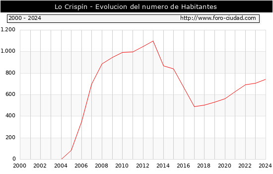 el numero de habitantes en Lo Crispín era de 741, 33 habitantes mas que el en el año 2023. En el grafico siguiente se puede ver cuantos habitantes tiene Lo Crispín a lo largo de los años.
