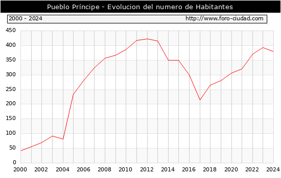 Segun los datos publicados por el INE a 1 de Enero de 2024 el numero de habitantes en Pueblo Príncipe era de 379, 14 habitantes menos que el en el año 2023. En el grafico siguiente se puede ver cuantos habitantes tiene Pueblo Príncipe a lo largo de los años.