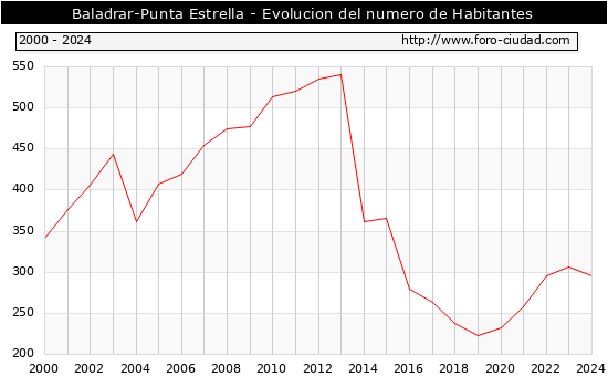 el numero de habitantes en Baladrar-Punta Estrella era de 296, 11 habitantes menos que el en el año 2023. En el grafico siguiente se puede ver cuantos habitantes tiene Baladrar-Punta Estrella a lo largo de los años.
