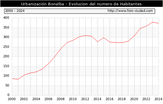 el numero de habitantes en Urbanización Bonalba era de 373, 5 habitantes menos que el en el año 2023. En el grafico siguiente se puede ver cuantos habitantes tiene Urbanización Bonalba a lo largo de los años.