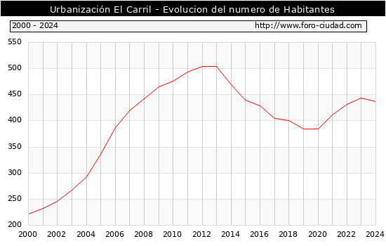 el numero de habitantes en Urbanización El Carril era de 437, 6 habitantes menos que el en el año 2023. En el grafico siguiente se puede ver cuantos habitantes tiene Urbanización El Carril a lo largo de los años.