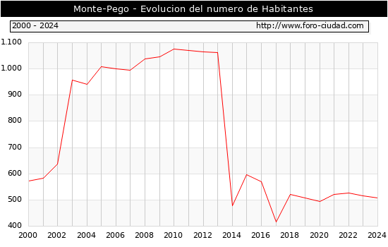 el numero de habitantes en Monte-Pego era de 507, 10 habitantes menos que el en el año 2023. En el grafico siguiente se puede ver cuantos habitantes tiene Monte-Pego a lo largo de los años.