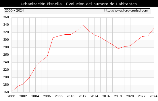 el numero de habitantes en Urbanización Pisnella era de 331, 20 habitantes mas que el en el año 2023. En el grafico siguiente se puede ver cuantos habitantes tiene Urbanización Pisnella a lo largo de los años.