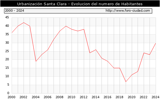 el numero de habitantes en Urbanización Santa Clara era de 30, 7 habitantes mas que el en el año 2023. En el grafico siguiente se puede ver cuantos habitantes tiene Urbanización Santa Clara a lo largo de los años.