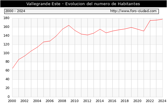 el numero de habitantes en Vallegrande Este era de 178, 2 habitantes mas que el en el año 2023. En el grafico siguiente se puede ver cuantos habitantes tiene Vallegrande Este a lo largo de los años.
