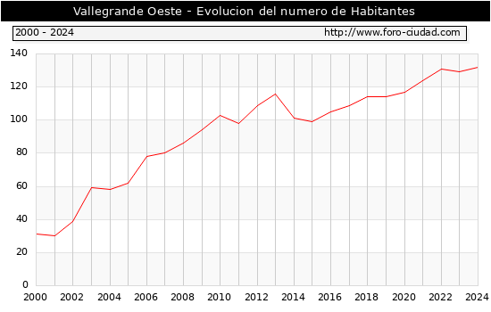 el numero de habitantes en Vallegrande Oeste era de 132, 3 habitantes mas que el en el año 2023. En el grafico siguiente se puede ver cuantos habitantes tiene Vallegrande Oeste a lo largo de los años.