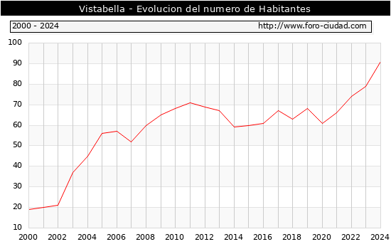 el numero de habitantes en Vistabella era de 91, 12 habitantes mas que el en el año 2023. En el grafico siguiente se puede ver cuantos habitantes tiene Vistabella a lo largo de los años.