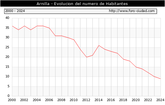 el numero de habitantes en Arnilla era de 9, 1 habitantes menos que el en el año 2023. En el grafico siguiente se puede ver cuantos habitantes tiene Arnilla a lo largo de los años.