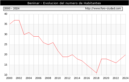 el numero de habitantes en Benínar era de 20, 2 habitantes mas que el en el año 2023. En el grafico siguiente se puede ver cuantos habitantes tiene Benínar a lo largo de los años.