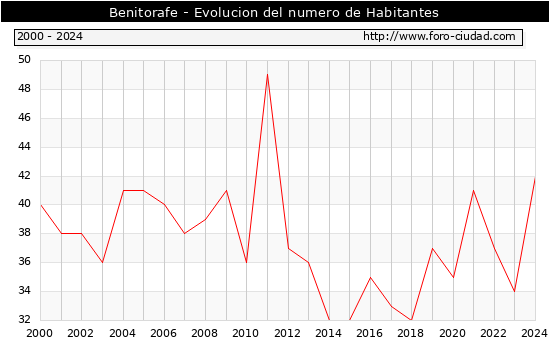 el numero de habitantes en Benitorafe era de 42, 8 habitantes mas que el en el año 2023. En el grafico siguiente se puede ver cuantos habitantes tiene Benitorafe a lo largo de los años.